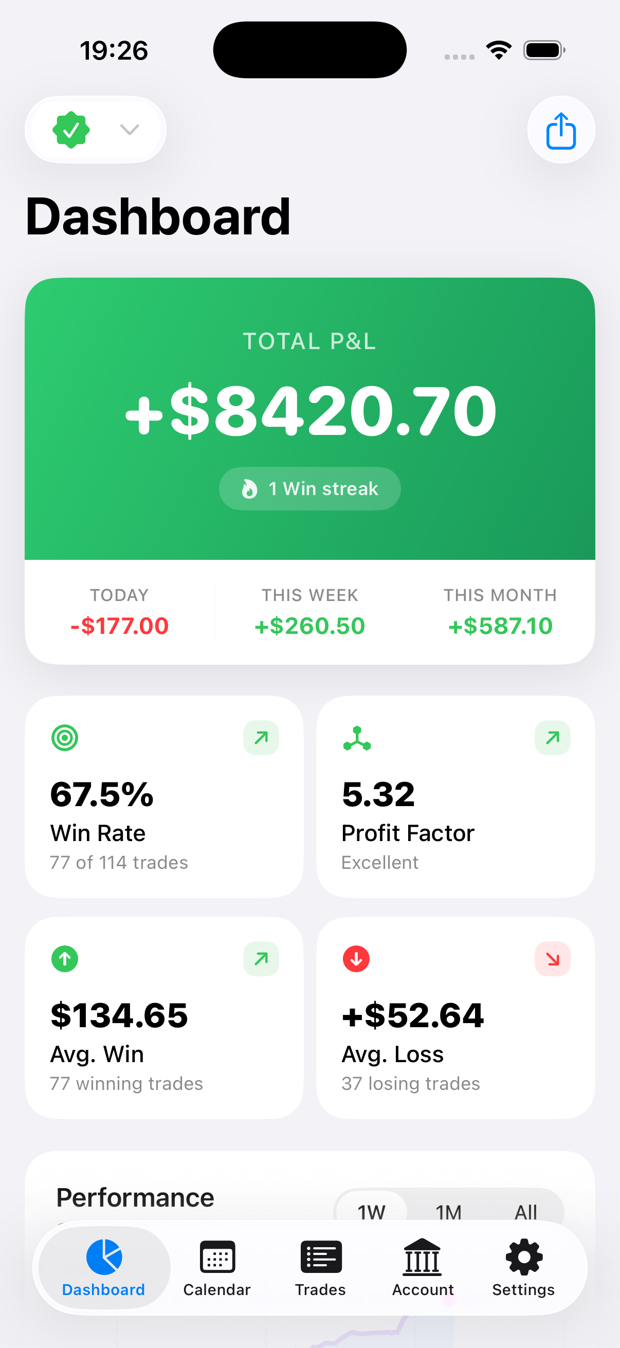 - Win rate and P&L per day at a glance